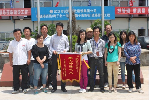 武漢天創(chuàng)市政建設(shè)工程有限公司行政部獲連通港西路項(xiàng)目部贈予 “職工的貼心人”榮譽(yù)錦旗 。