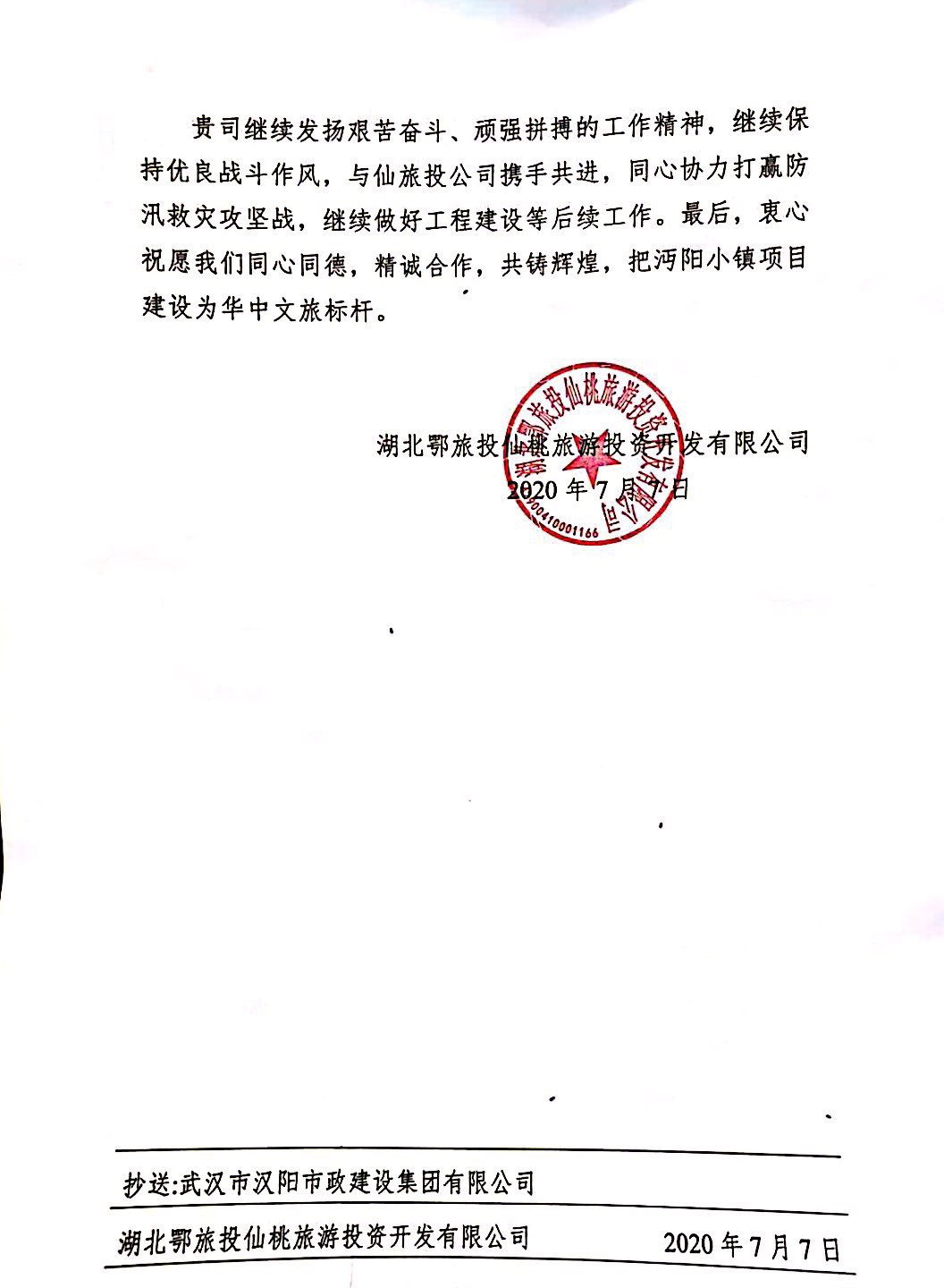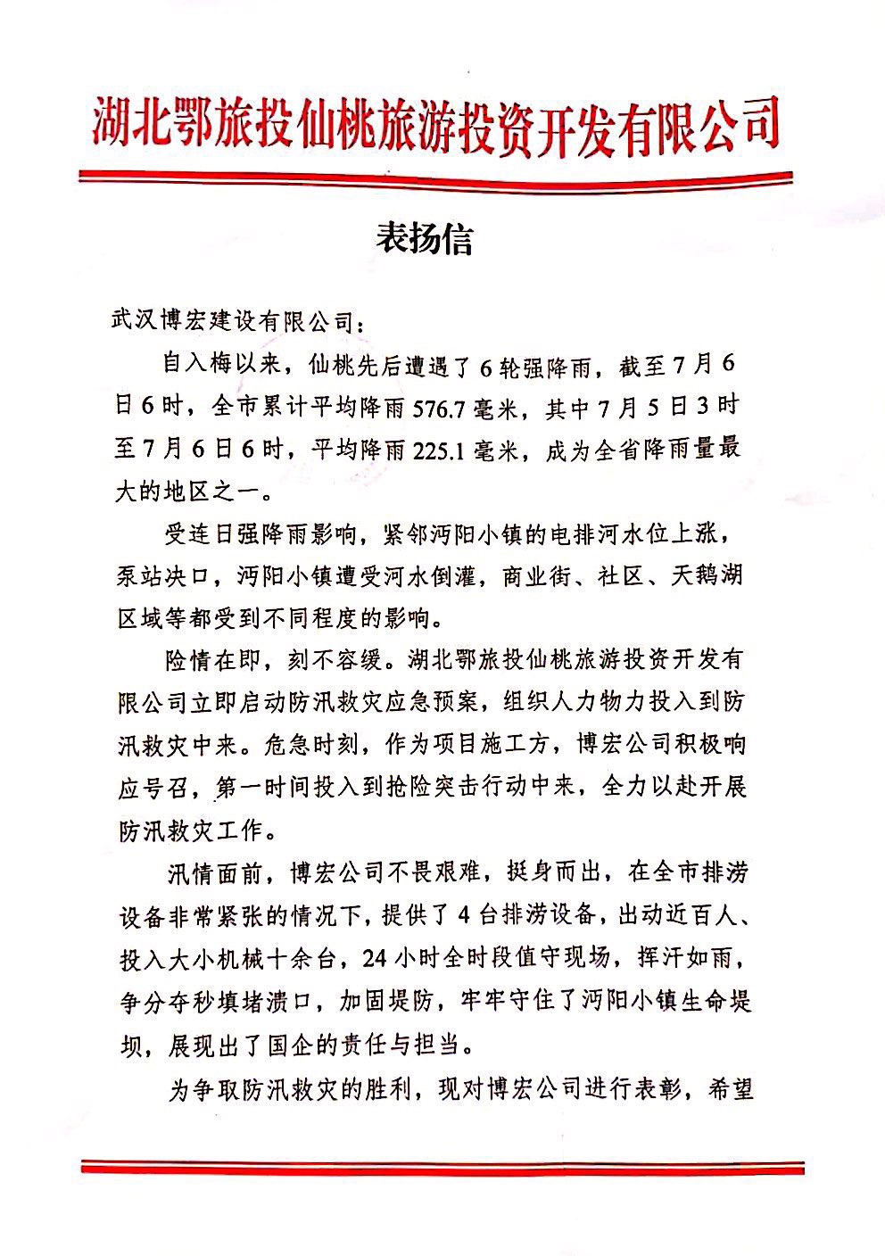 ? ? ? 2020年7月7日,鄂旅投仙桃公司給博宏建設(shè)送來表揚(yáng)信,感謝博宏公司在汛情面前,不畏艱險(xiǎn)挺身而出,為沔陽小鎮(zhèn)筑起生命之堤。