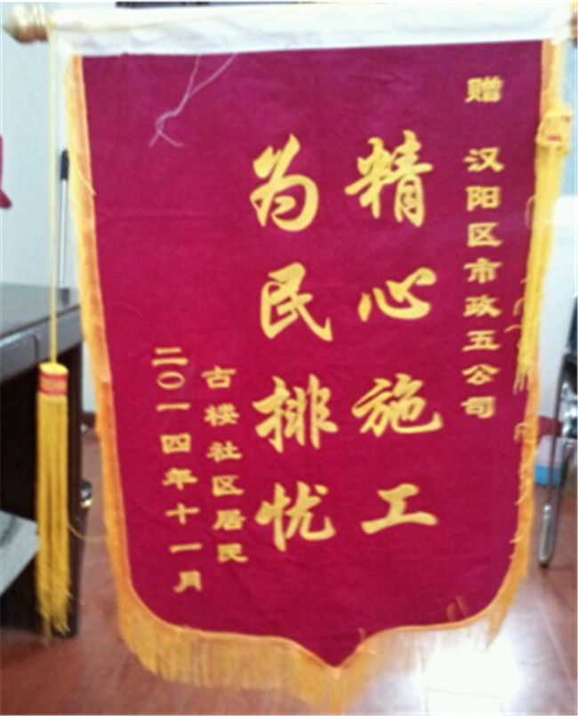 今年,五公司負(fù)責(zé)2014年老舊社區(qū)道路維修工程。該工程包括古樓社區(qū)、水仙里社區(qū)、墨北社區(qū)等多個(gè)社區(qū),迄今為止已完成步磚面積約為1000㎡,工程質(zhì)量受到社區(qū)居民和建設(shè)單位的好評(píng)。12月1日,古樓社區(qū)居民代表,將一面“精心施工、為民排憂”的錦旗贈(zèng)與了五公司,感謝五公司工程部為古樓社區(qū)作出的貢獻(xiàn)。