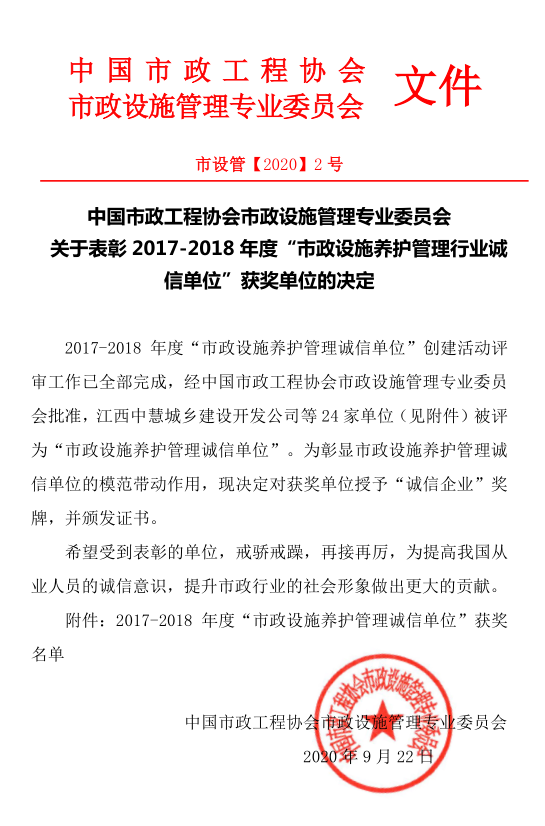 近日,經(jīng)過中國市政工程協(xié)會市政設(shè)施管理專業(yè)委員會評選,漢陽市政首次榮獲2017-2018年度“市政設(shè)施養(yǎng)護管理誠信單位”,彰顯了公司在市政管養(yǎng)領(lǐng)域的模范帶頭作用。