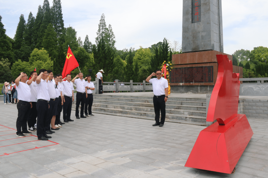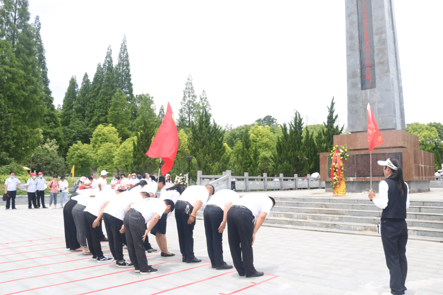 ? ? ? 向人民英雄敬獻(xiàn)花籃儀式,在瞿家灣烈士陵園紀(jì)念碑前舉行。全體黨員深深鞠躬,懷著敬仰之情,向革命烈士默哀。