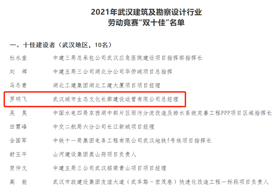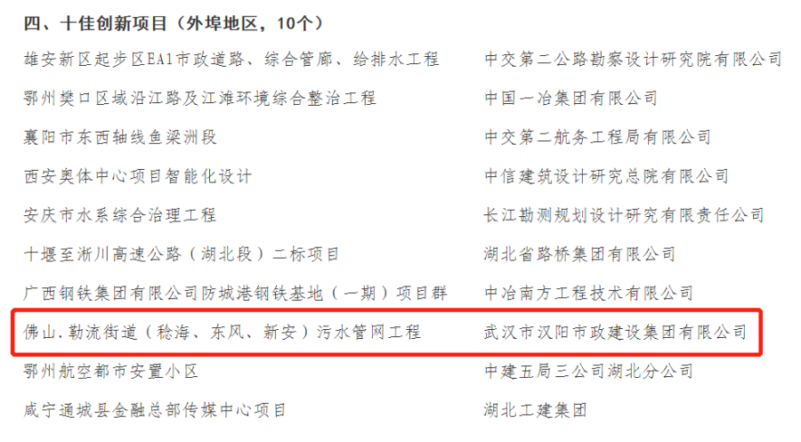 在2021年第七屆武漢建筑及勘察設(shè)計(jì)行業(yè)勞動(dòng)競(jìng)賽“雙十佳”選樹(shù)活動(dòng)中,羅明飛獲評(píng)武漢地區(qū)十佳建設(shè)者,漢陽(yáng)市政承建的廣東佛山勒流街道(稔海、東風(fēng)、新安)污水管網(wǎng)工程獲評(píng)外埠地區(qū)十佳創(chuàng)新項(xiàng)目。