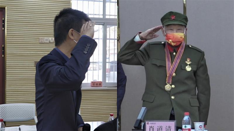 在熱烈的掌聲中,肖道清深情地講起自己在抗美援朝前線作戰(zhàn)的經(jīng)歷。16歲的他積極響應(yīng)國家號召,從武漢奔赴東北,到有“人民空軍的搖籃”之稱的東北民主聯(lián)軍航空學(xué)校進(jìn)行學(xué)習(xí),光榮地成為一名空軍塔臺的指揮員,與戰(zhàn)友跨過鴨綠江,一起爬冰臥雪、在零下三十多度的戰(zhàn)場上,枕戈待旦、奮勇搏殺。說到最后,肖道清激動地舉起手,敬了一個標(biāo)準(zhǔn)的軍禮。