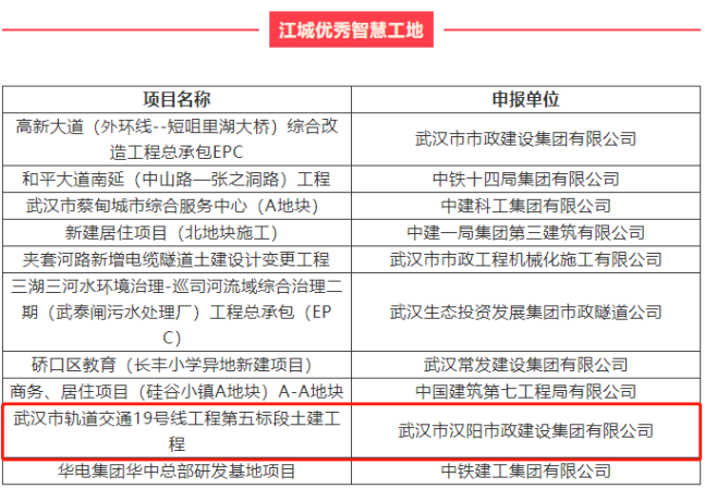 近日,由楚天都市報(bào)、武漢建筑業(yè)協(xié)會(huì)、武漢市建筑行業(yè)工會(huì)聯(lián)合會(huì)聯(lián)合主辦的2021年“創(chuàng)領(lǐng)智控杯”江城“雙十大”選樹結(jié)果揭曉,漢陽市政高新三路(三環(huán)線-外環(huán)線)改造提升工程總承包(EPC)獲評(píng)“江城十大智慧工地”,創(chuàng)智路、徑河路、徑河五路、徑河五路跨徑河橋、黃獅海東路工程總承包(EPC)獲評(píng)“江城文明工地”,武漢市軌道交通19號(hào)線工程第五標(biāo)段土建工程獲評(píng)“江城優(yōu)秀智慧工地”。