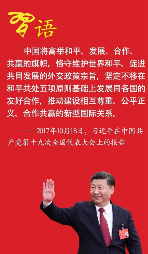 中國將高舉和平、發(fā)展、合作、共贏的旗幟,恪守維護(hù)世界和平、促進(jìn)共同發(fā)展的外交政策宗旨,堅(jiān)定不移在和平共處五項(xiàng)原則基礎(chǔ)上發(fā)展同各國的友好合作,推動(dòng)建設(shè)相互尊重、公平正義、合作共贏的新型國際關(guān)系。