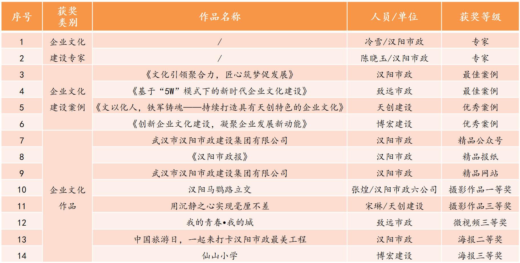 近日,中國施工企業(yè)管理協(xié)會發(fā)布《關(guān)于公布第二批工程建設(shè)企業(yè)文化建設(shè)專家的通知》《關(guān)于公布工程建設(shè)企業(yè)文化建設(shè)最佳案例和優(yōu)秀案例的通知》《關(guān)于公布2022年工程建設(shè)企業(yè)文化作品競賽結(jié)果的通知》,漢陽市政斬獲14項企業(yè)文化建設(shè)類榮譽(yù)!