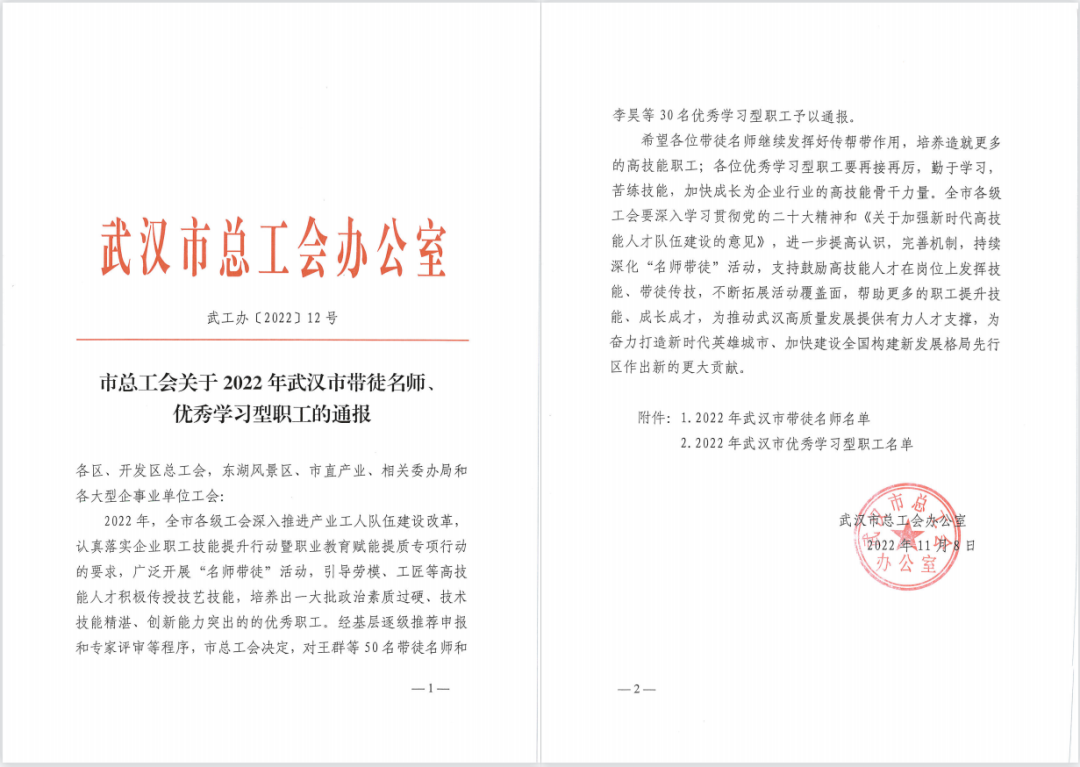 師徒結(jié)對(duì)傳匠心,青藍(lán)相接鑄輝煌。2022年11月8日,根據(jù)武漢市總工會(huì)辦公室發(fā)布的《市總工會(huì)關(guān)于2022年武漢市帶徒名師、優(yōu)秀學(xué)習(xí)型職工的通報(bào)》,漢陽(yáng)市政羅明飛、李子豪、陳文獲評(píng)“武漢市帶徒名師”,林志剛、易曉輝獲評(píng)“武漢市優(yōu)秀學(xué)習(xí)型職工”。