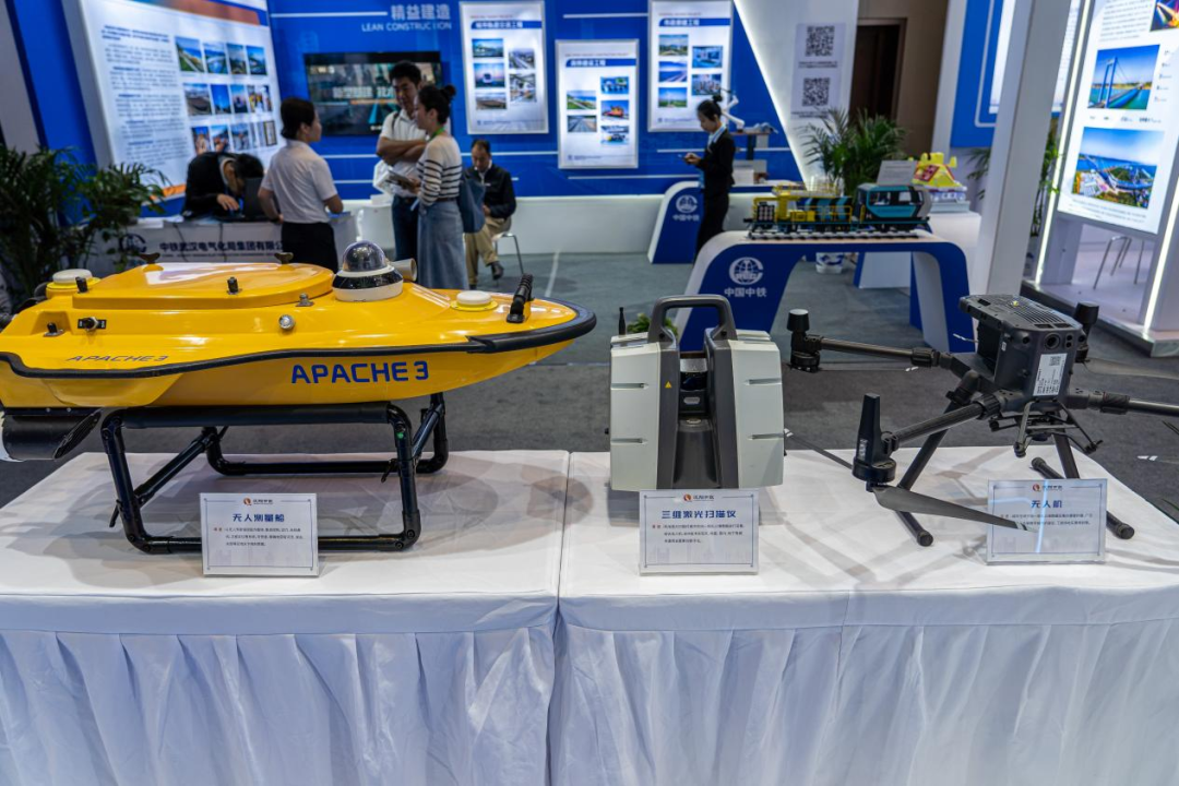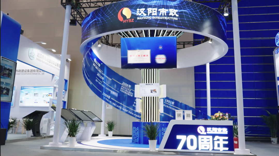 漢陽市政展區(qū)以綠色建造、智能建造為主題,分享集團(tuán)數(shù)字化轉(zhuǎn)型的成果。本次展覽告別傳統(tǒng)展陳形式,以漢陽樹為靈感,樹冠處連接飄帶,增添靈動感,大面積采用科技藍(lán)、白色來點(diǎn)綴,營造不一樣的活力氛圍。展區(qū)以漢陽樹為中心,展示了公司70年發(fā)展歷程、取得的重點(diǎn)業(yè)績和榮譽(yù)獎(jiǎng)項(xiàng)、聯(lián)合體工作、綠色技術(shù)、綠色產(chǎn)業(yè),以及企業(yè)數(shù)字化轉(zhuǎn)型、CIM基礎(chǔ)平臺建設(shè)等內(nèi)容。