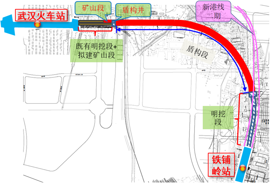 武漢市軌道交通新港線一期工程線路全長10.71km,共設站5座。其中新港線一標包含北洋橋站(明挖車站)、北洋橋站~武漢火車站(盾構(gòu)及明挖區(qū)間)、武漢火車站(既有站內(nèi)改造)、武漢火車站~鐵鋪嶺站(盾構(gòu)及明挖區(qū)間)2站2區(qū)間。