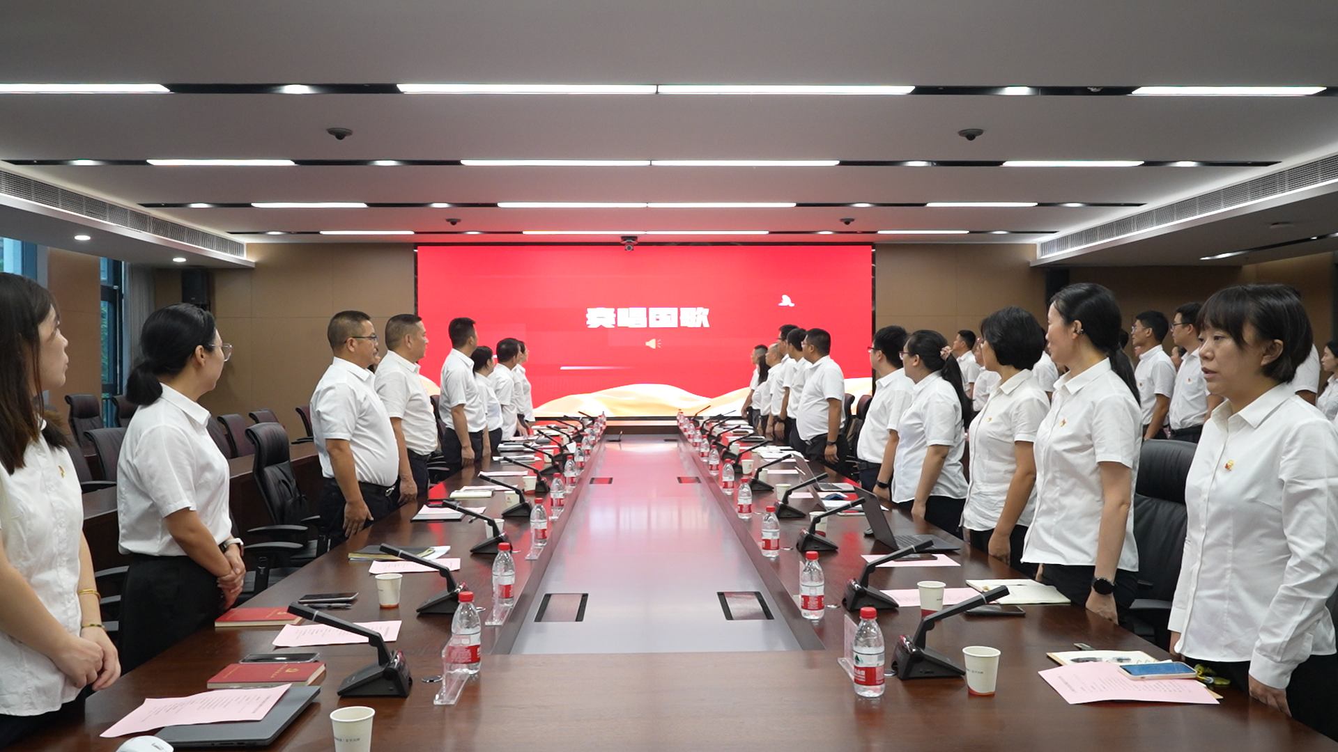 大會在莊嚴(yán)的國歌聲中拉開序幕,與會人員全體起立奏唱國歌。